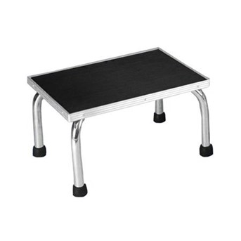 Estructura de tubo redondo de 1” cal.18, acabado en cromo, plataforma en lámina de acero esmaltado cal.20 con moldura perimetral de aluminio con cubierta de tapete negro y regatones antiderrapantes.