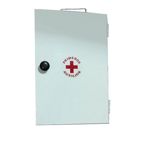 Fabricado en lámina calibre.24 esmaltado a pintura horneada con tres entrepaños para organizar, con asa integrada para sostener con bisagra de libro y jaladera de plástico negra, etiqueta de primeros auxilios.